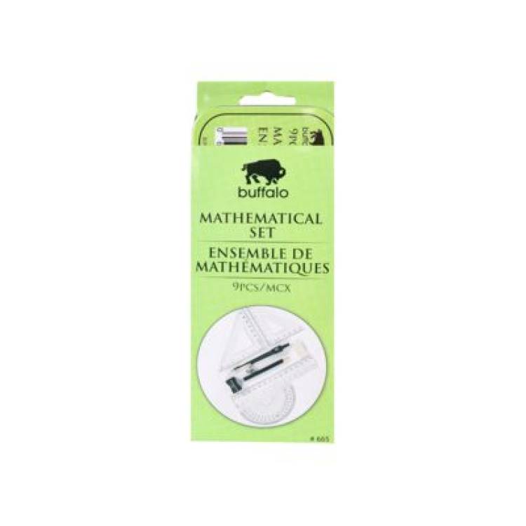 contents: - Compass, - Triangle 1 (45-45-90º), - Triangle 2 (30-60-90º), - Ruler (6”/15cm), - Protractor (4’’/10.1cm), - Wood pencil (3’’/7.6cm), - Eraser, - Sharpener, - Conversion table.
