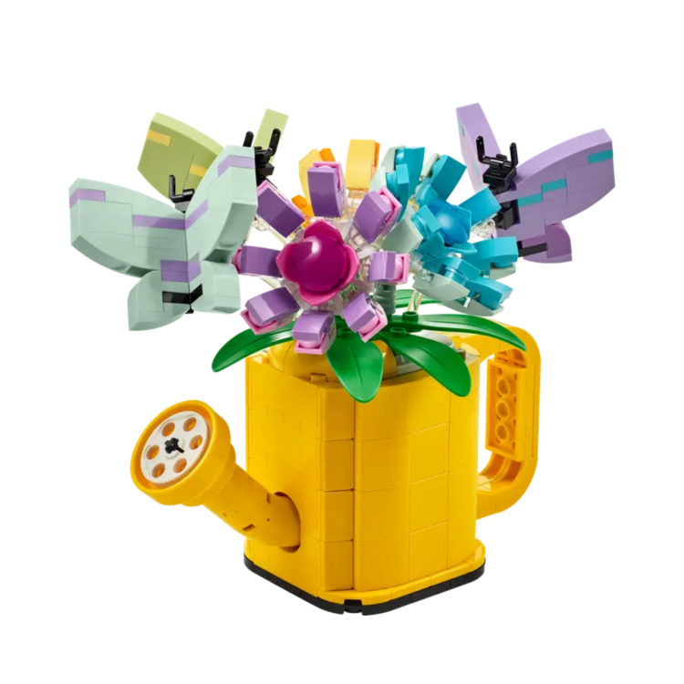 Build, rebuild, play with and display 3 colorful models inspired by nature with this LEGO® Creator 3in1 Flowers in Watering Can (31149) set. It features a brick-built yellow watering can toy with a handle and spout. It’s filled with 3 flower toys with movable petals and 3 butterfly toys on transparent sticks that give the impression they are flying.